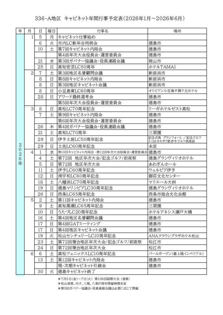 ライオンズクラブ国際協会336-A地区 公式サイト 2024.10.162025.12.24 目次 地区ガバナー地区年次大会徳島キャビネット新着情報年間行事予定RC・ZC地区委員会 地区ガバナー 所信 運営基本方針 地区組織表 ↑ 目次に戻る 地区年次大会 第72回地区年次大会 徳島大会 特設ページはこちら 336複合地区 第72回年次大会in島根 特設ページはこちら ↑ 目次に戻る 徳島キャビネット 新着情報 336-A地区 国際平和ポスター審査結果 年末年始休局のお知らせ 第2回地区キャビネット会議資料 ⇒ その他のキャビネット資料・お知らせはこちら 年間行事予定 2025-2026年度 年間行事予定表 2025-2026年度 クラブ周年行事予定一覧 ↑ 目次に戻る RC・ZC 1R2R3R4R5R6R7R8R9R1Z1Z1Z1Z1Z1Z1Z1Z1Z2Z2Z2Z2Z2Z2Z2Z2Z2Z3Z3Z3Z3Z3Z3Z4Z4Z ※ 3R3Zは2024-2025年度まで ↑ 目次に戻る 地区委員会 GAT・GMA・会則・mission1.5委員会M・地区誌・Digital委員会青少年・LCIF・ライオンズクエスト委員会環境保全・保健福祉委員会YCE・国際関係・ライオンズレオ委員会地区年次大会委員会アラート委員会国際平和ポスター ↑ 目次に戻る